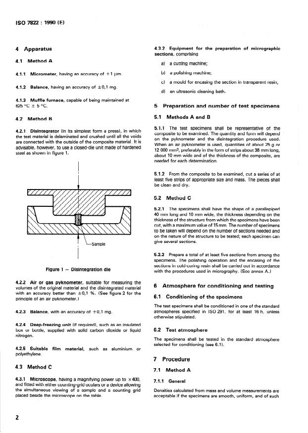 - Method B – Mechanical disintegration: Destructive technique where specimens are crushed/delaminated and volumes measured (air/gas pyknometer). Suitable when constituent densities are unknown. Requires care with ductile matrices (may need embrittlement by cooling). Pyknometer volume accuracy should be better than ±0.1%.