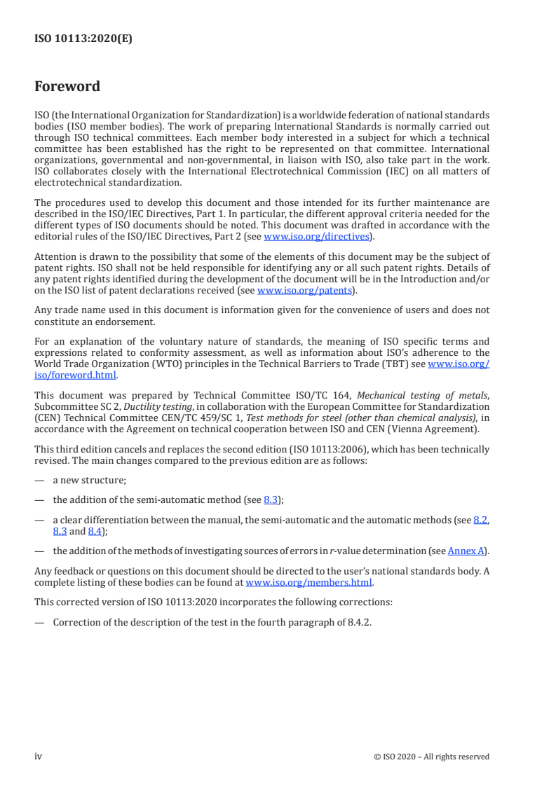 ISO 10113:2020 is a standard published by the International Organization for Standardization (ISO). Its full title is "Metallic materials - Sheet and strip - Determination of plastic strain ratio". This standard covers: This document specifies a method for determining the plastic strain ratio of flat products (sheet and strip) made of metallic materials.