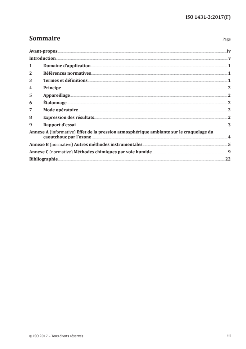 ISO 1431-3:2017 décrit trois types de méthodes destinées à déterminer la concentration d'ozone dans des enceintes d'essai de laboratoire. Méthode A ? Absorption dans l'ultraviolet: il s'agit de la méthode de référence, qui est utilisée comme moyen d'étalonnage des autres méthodes, B et C. Méthode B ? Techniques instrumentales: B1: méthode électrochimique B2: chimiluminescence Méthode C ? Techniques chimiques par voie humide: Mode opératoire I Mode opératoire II Mode opératoire III