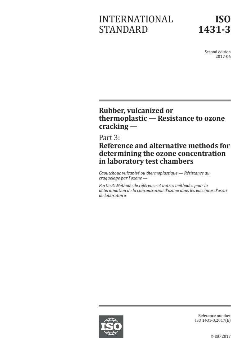 ISO 1431-3:2017 - Rubber, vulcanized or thermoplastic — Resistance to ozone cracking — Part 3: Reference and alternative methods for determining the ozone concentration in laboratory test chambers Released:7/12/2017
