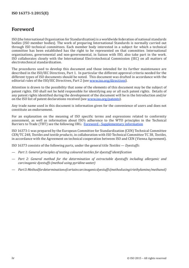 ISO 16373-1:2015 is a standard published by the International Organization for Standardization (ISO). Its full title is "Textiles - Dyestuffs - Part 1: General principles of testing coloured textiles for dyestuff identification". This standard covers: ISO 16373-1:2015 gives the definition of the colourant classes and the relationship to textile fibres. It describes some procedures to identify qualitatively the colourant class used in textile material.