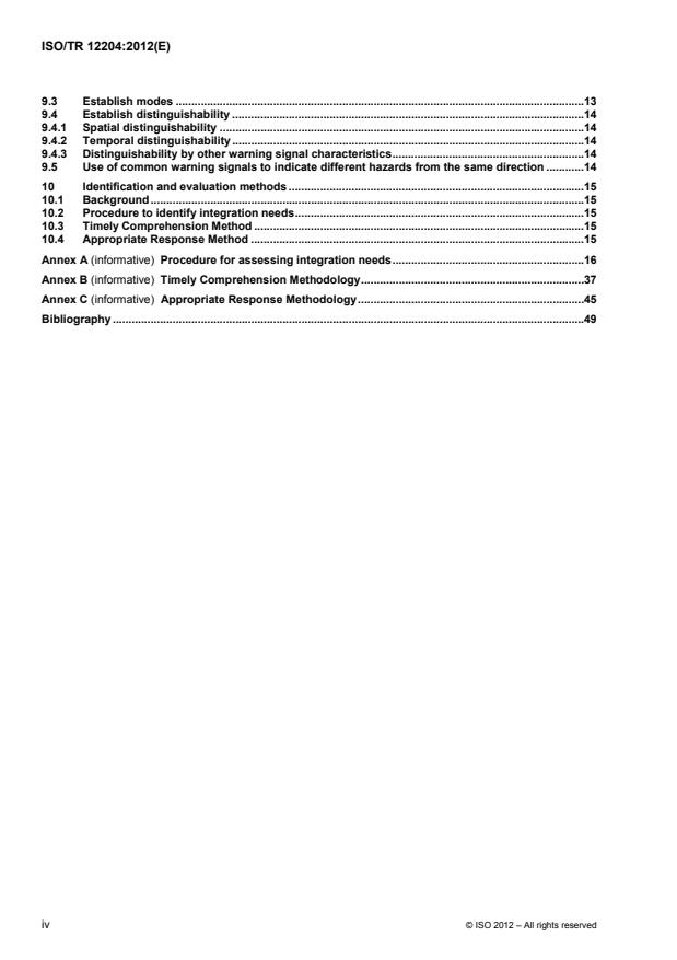 ISO/TR 12204:2012 is a technical report published by the International Organization for Standardization (ISO). Its full title is "Road vehicles - Ergonomic aspects of transport information and control systems - Introduction to integrating safety critical and time critical warning signals". This standard covers: ISO/TR 12204:2012 provides general, informative guidance for the integration of safety critical and time critical warning signals (signals which, if ignored even briefly, could result in bodily harm to the occupant(s) of the vehicle and/or to other road users) into existing in-vehicle messages presented to a driver. Integration of non-critical signals are outside the scope of ISO/TR 12204:2012, except to confirm that they do not affect the driver's comprehension of safety and time critical signals. ISO/TR 12204:2012 provides: 1) possible approaches for determining if integration is necessary to mitigate the possibility that signals from one or more vehicle system may degrade the driver's comprehension of, or response to, safety critical warning signals from another system(s); and 2) a discussion of possible methods for assessing potential integration conflicts.