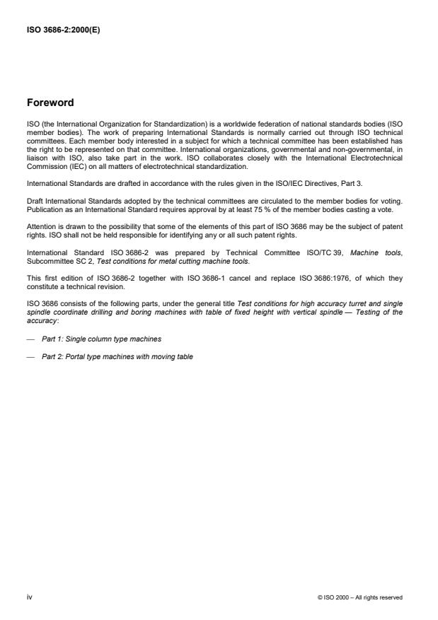 Keywords: ISO 3686-2:2000, portal type machines, moving table, coordinate drilling and boring machines, testing of the accuracy, geometric tests, machining tests, spindle run‑out, table flatness, ISO 230-1.