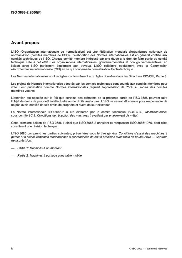 ISO 3686-2:2000 defines test conditions and acceptance checks for high‑accuracy portal‑type coordinate drilling and boring machines with a moving table and a vertical spindle. It is Part 2 of ISO 3686 and focuses on testing of the accuracy (geometric and machining tests) for portal machines. The standard complements ISO 230-1 by specifying machine‑type‑specific tests, tolerances and measuring practices for precision drilling/boring equipment.