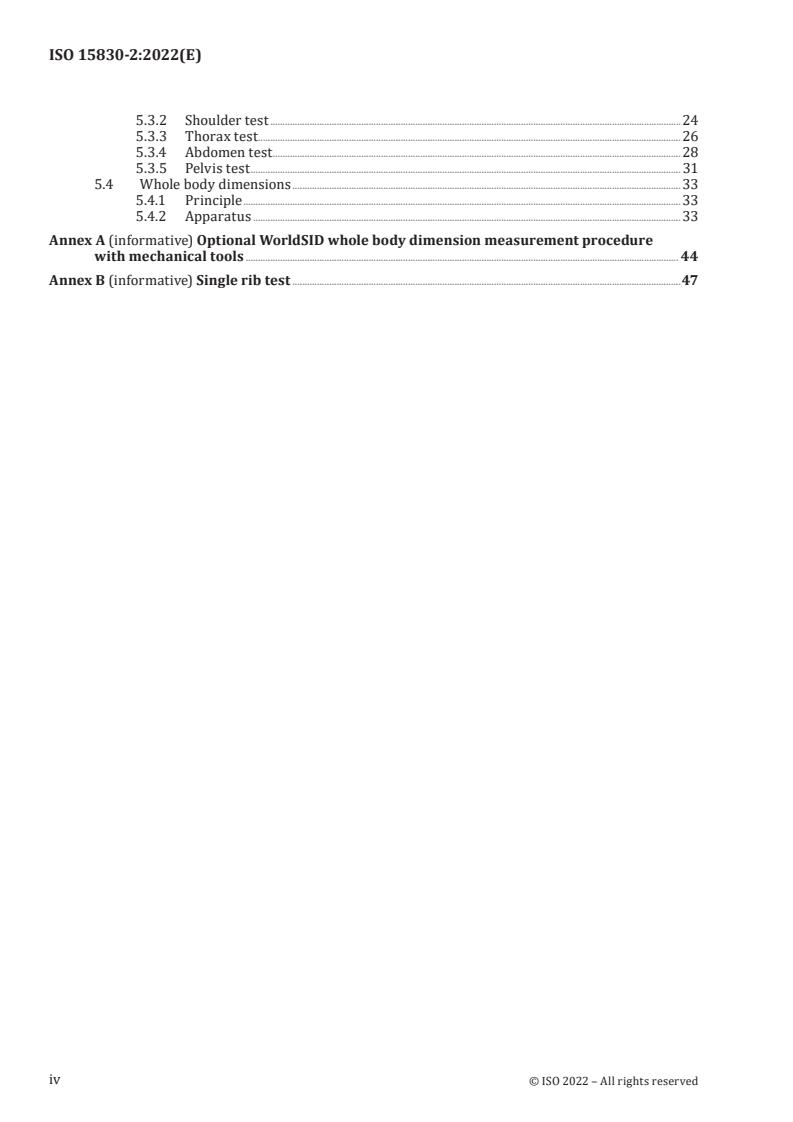 ISO 15830-2:2022 is a standard published by the International Organization for Standardization (ISO). Its full title is "Road vehicles - Design and performance specifications for the WorldSID 50th percentile male side-impact dummy - Part 2: Mechanical subsystems". This standard covers: This document specifies requirements for mechanical components, specifications and validation tests for the WorldSID 50th percentile side-impact dummy, a standardized anthropomorphic dummy for near-side-impact tests of road vehicles.