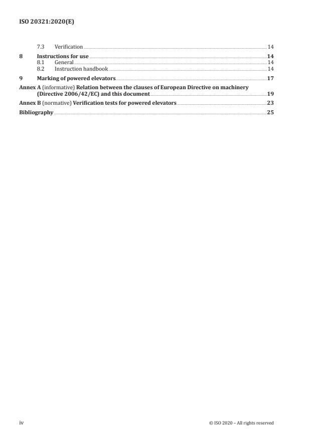 ISO 20321:2020 is a standard published by the International Organization for Standardization (ISO). Its full title is "Petroleum, petrochemical and natural gas industries - Safety of machineries - Powered elevators". This standard covers: This document specifies general safety requirements for the design, testing and production of powered elevators. The requirements are applicable for onshore and offshore applications of such elevators in the petroleum and petrochemical industries. This document does not cover any other type of elevator. It is not applicable to the following types of products: - remote control devices; - lifting nubbins; - lifting plugs; - lifting subs; - internal gripping devices; - equipment for lifting tubular from and onto a vessel; - elevator links or bails. This list is not exhaustive. This document is not applicable to powered elevators manufactured before the date of this publication. NOTE Annex A provides the relation between the clauses of the European Directive on machinery (Directive 2006/42/EC) and this document, for potential significant hazards and the safety requirements dealing with them for powered elevators.