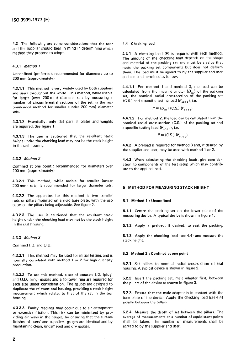 Specifies methods for measuring sealing devices having more than one seal in the set. Specifies methods for measuring stack height in order to determine that the sets are to an acceptable dimensional standard. Does not specify the dimensions for packing sets or their components. Describes three acceptable methods, and figure 1 shows a typical measuring device for the methods 1 and 2, the figures 3 and 4 show a typical setup for the methods 2 and 3, and figure 2 shows a typical device for the method 2.