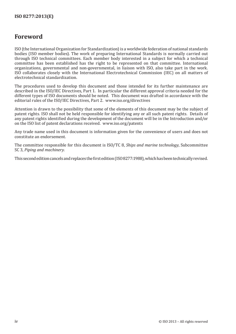 ISO 8277:2013 is a standard published by the International Organization for Standardization (ISO). Its full title is "Ships and marine technology - Pipework and machinery - Information transfer". This standard covers: ISO 8277:2013 specifies the minimum data needed for the prefabrication and assembly of pipework and for its transfer from engineering departments to workshops in the shipbuilding industry. ISO 8277:2013 is applicable to written information needed for construction of piping installations that marine piping equipment manufacturers submit through specifications and instructions to shipyards on shipbuilding. ISO 8277:2013 is not applicable to the generation, type presentation and filing organization of this data.