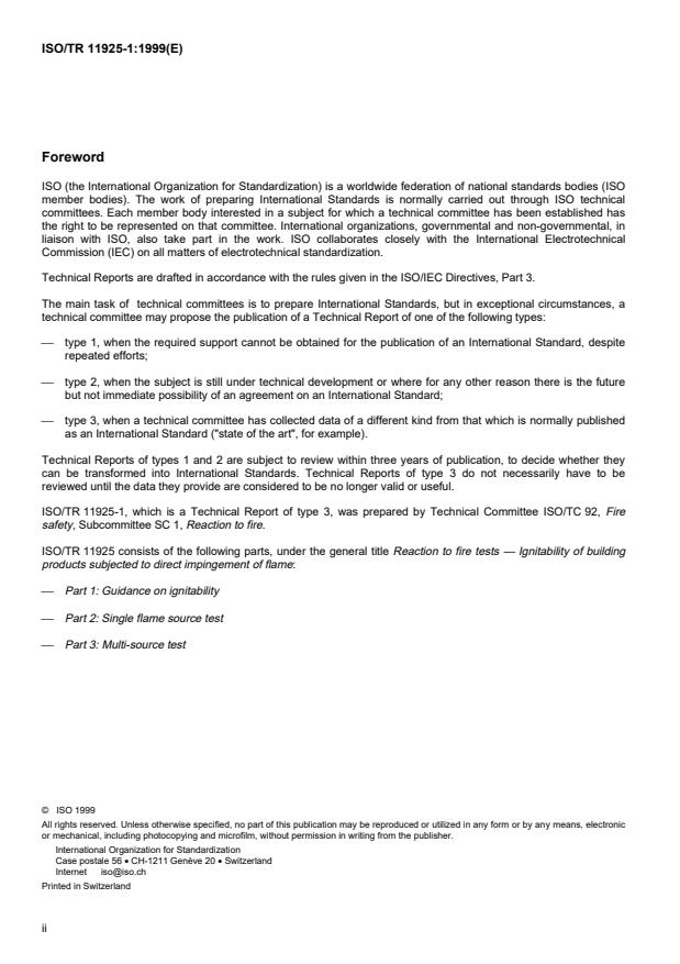 ISO/TR 11925-1:1999 is a technical report published by the International Organization for Standardization (ISO). Its full title is "Reaction to fire tests - Ignitability of building products subjected to direct impingement of flame - Part 1: Guidance on ignitability". This standard covers: This Technical Report provides guidance on "ignitability" tests for building products. It describes the principles of ignitability and characterizes different ignition sources. The results of small-scale ignitability tests may be used as a component of a total hazard analysis of a specified fire scenario. It is therefore important that the flame or radiative source chosen is fully characterized so that relevant conclusions may be made from the test results. Guidance given in this Technical Report may also have relevance to other application areas (e.g. building contents, plastics, etc.)