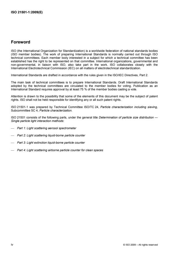 ISO 21501-1:2009 specifies characteristics of a light scattering aerosol spectrometer (LSAS) which is used for measuring the size, number concentration and number/size distribution of particles suspended in a gas. The light scattering technique described in this document is based upon single particle measurements. The size range of particles measured by this method is between approximately 0,06 µm to 45 µm in diameter. Instruments that conform to ISO 21501-1:2009 are used for the determination of the particle size distribution and particle number concentration at relatively high concentrations of up to 1011 particles/m3. Application fields include: characterization of metered dose inhalers (MDI), dry powder inhalers (DPI) and nebulizers in pharmacy; production control of active agents; cut-off determination: impactors, cyclones and impingers; atmospheric aerosols: bio-aerosols, stables/composting facilities, nebulized droplets, measurements in street tunnels; fractional separation efficiency determination of filters. For the above-mentioned applications, aerosol spectrometers should determine the particle size distribution, particle number concentration, size resolution and sizing accuracy as accurately as possible. These aerosol spectrometers are not suitable for the classification of clean rooms.