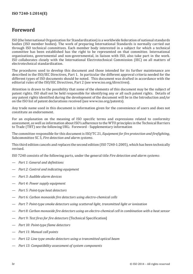 ISO 7240-1:2014 provides a set of general guidelines and definitions used in describing the fire detection and alarm system (FDAS) equipment installed in and around buildings, and the tests and requirements for these equipments in the other parts of ISO 7240. ISO 7240-1:2014 does not apply to smoke alarms, the requirements for which are specified in ISO 12239.