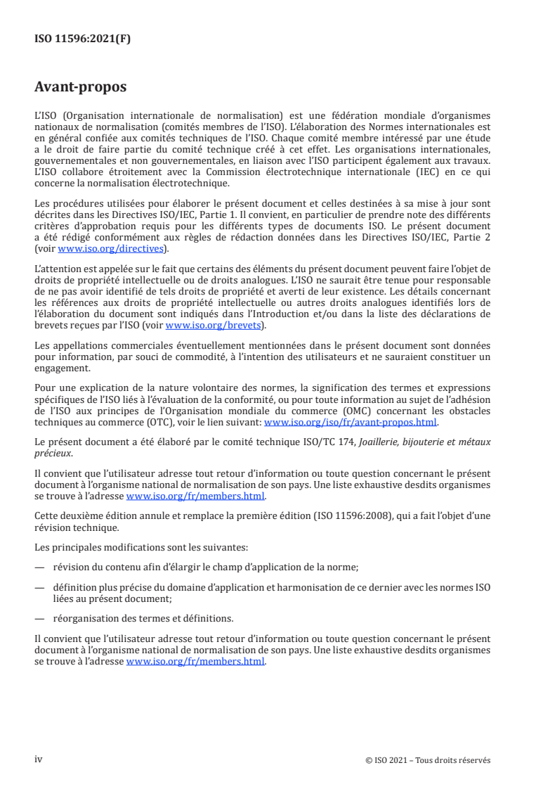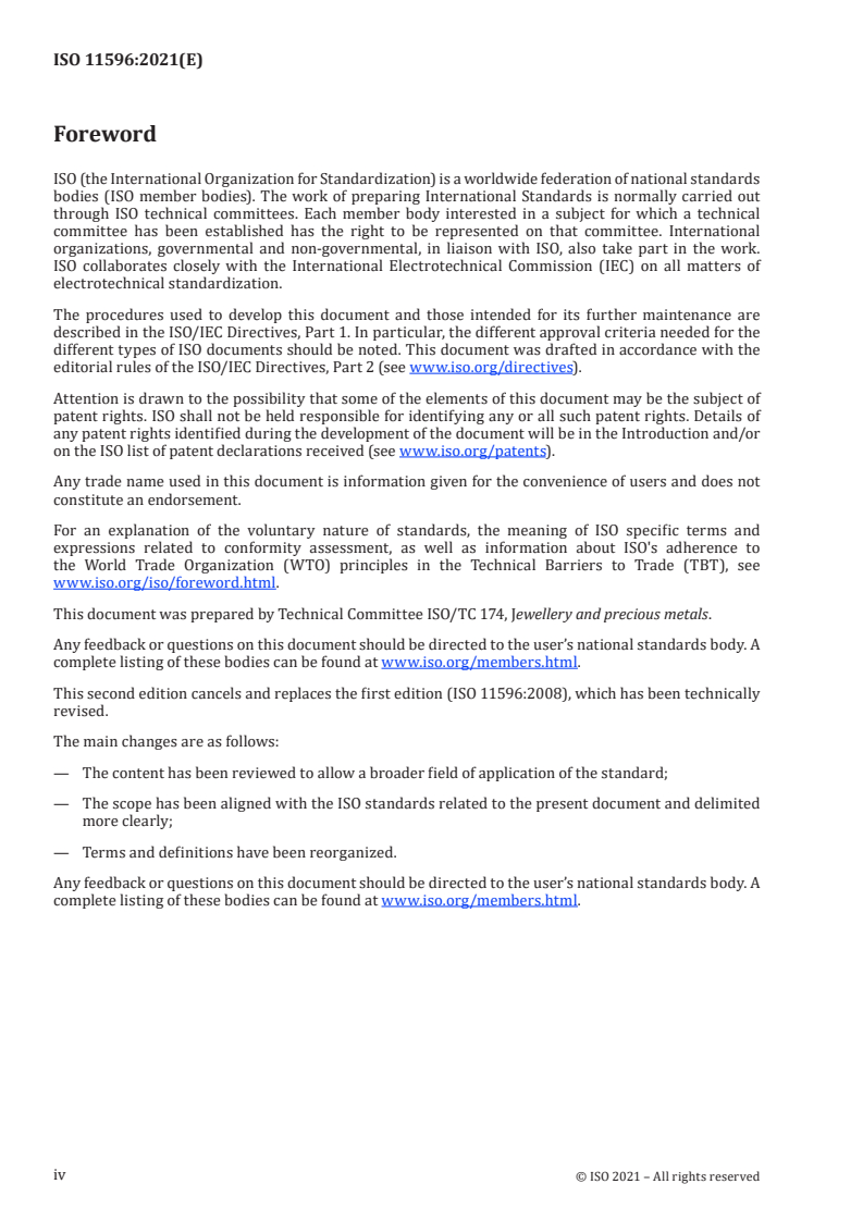 ISO 11596:2021 is a standard published by the International Organization for Standardization (ISO). Its full title is "Jewellery and precious metals - Sampling of precious metals and precious metal alloys". This standard covers: This document specifies a method of sampling precious metals and precious metal alloys for the determination of their precious metal content and for the assessment of their homogeneity. The document is applicable to raw materials, semi-finished products and finished products and is intended to be used only for the sampling of entirely metallic materials. NOTE 1 Standards for determination of precious metals contents for different metals are listed in the Bibliography. NOTE 2 For assaying techniques different from the listed ones other sampling procedures can be required. NOTE 3 For the purpose of production control or lot inspections the International Standards for the sampling indicated in the Bibliography or corresponding guidelines can be applied in addition.