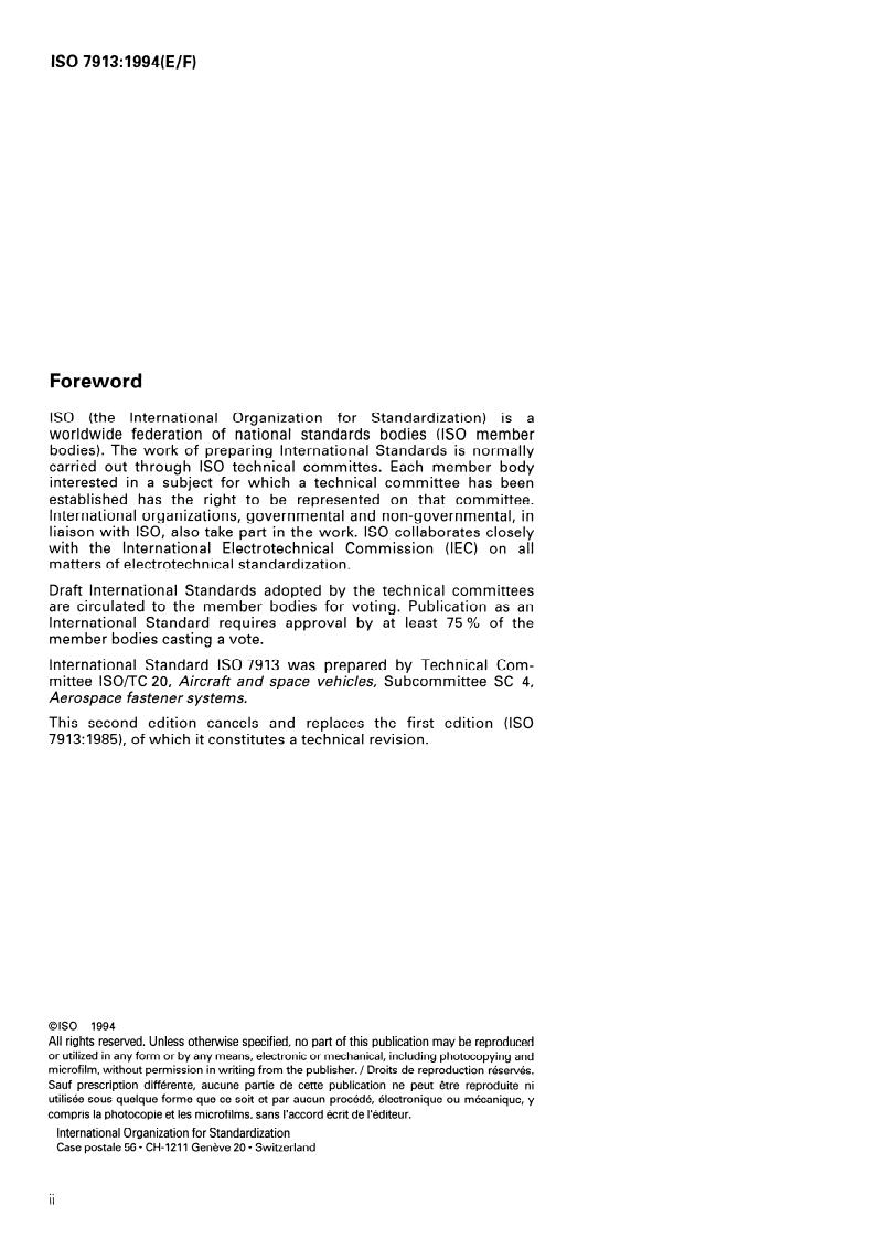 ISO 7913:1994 is a standard published by the International Organization for Standardization (ISO). Its full title is "Aerospace - Bolts and screws, metric - Tolerances of form and position". This standard covers: Cancels and replaces the first edition (1985). Specifies the tolerances of form and position applicable to all types of metric bolts and screws in the nominal thread diameter range 3 mm to 24 mm used in aerospace construction. Intended for the drawing up of aerospace product standards.