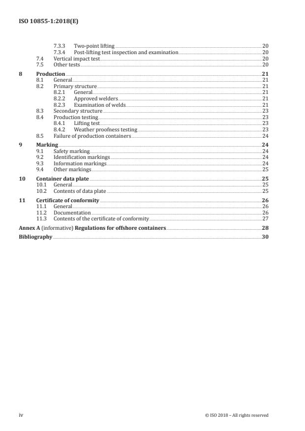 This document specifies requirements for the design, manufacture and marking of offshore containers with a maximum gross mass not exceeding 25 000 kg, intended for repeated use to, from and between offshore installations and ships. This document specifies only transport-related requirements.