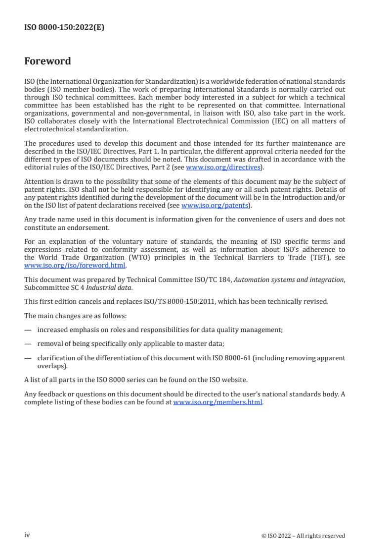 ISO 8000-150:2022 is a standard published by the International Organization for Standardization (ISO). Its full title is "Data quality - Part 150: Data quality management: Roles and responsibilities". This standard covers: This document specifies the key considerations for organizations that are establishing appropriate roles and responsibilities for data quality management. The following are within the scope of this document: - implementing roles and responsibilities for data quality management; - providing documentary evidence of this implementation; - a framework for roles and responsibilities; - a functional model of roles and responsibilities; - example deployment scenarios for the framework of roles and responsibilities; - comparison with the processes specified by ISO 8000‑61. The following are outside the scope of this document: - process reference models for data quality management (ISO 8000‑61 specifies a process reference model for data quality management); - methods for data quality evaluation and certification; - models for assessing the maturity of data quality management (ISO 8000‑62 and ISO 8000‑64 specify approaches to assessing the maturity of data quality management). This document can be used in conjunction with or independently of standards for quality management systems.