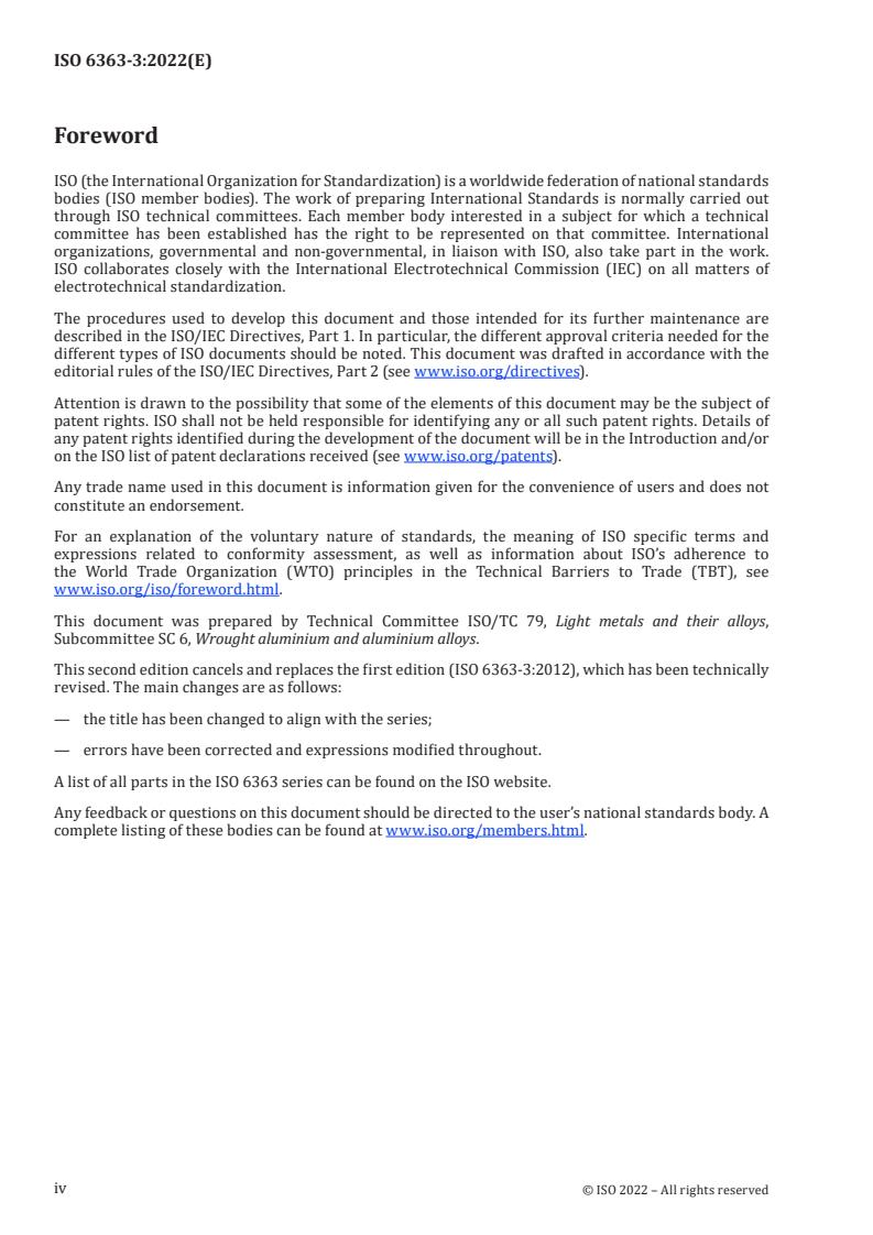 ISO 6363-3:2022 is a standard published by the International Organization for Standardization (ISO). Its full title is "Wrought aluminium and aluminium alloys - Cold-drawn rods/bars, tubes and wires - Part 3: Tolerances on form and dimensions for drawn rods/bars and wires". This standard covers: This document specifies tolerances on form and dimensions for wrought aluminium and aluminium alloy drawn round bars and wires having diameters in the range of from 1 mm to 100 mm inclusive. The tolerances on diameter specified in this document are symmetric plus and minus tolerances. For wires, this document does not apply to electrical, welding and aeronautical purposes. For drawn bars, 4.1 to 4.5 apply, and only 4.1 and 4.2 apply to drawn wires.