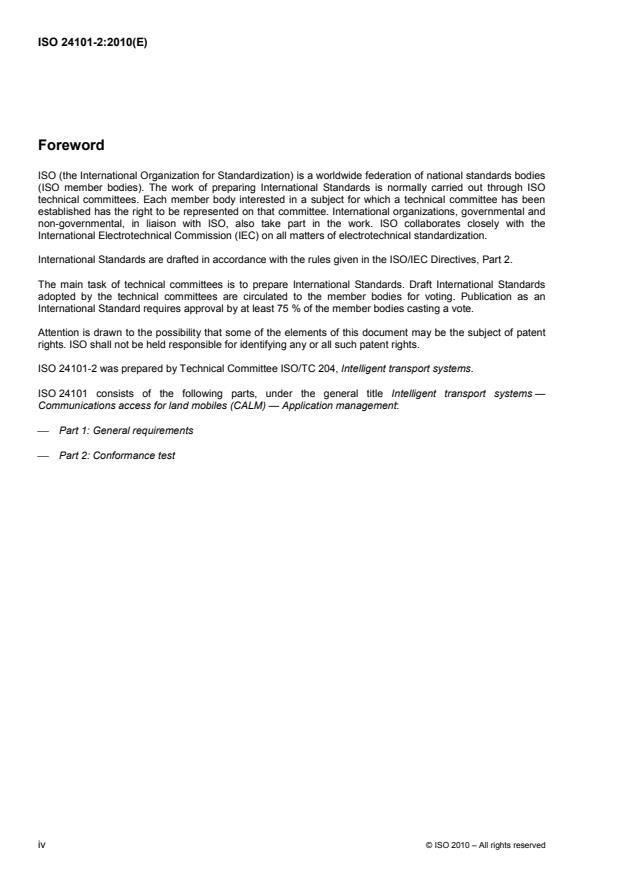 ISO 24101-2:2010 is a standard published by the International Organization for Standardization (ISO). Its full title is "Intelligent transport systems - Communications access for land mobiles (CALM) - Application management - Part 2: Conformance test". This standard covers: ISO 24101-2:2010 specifies the test system, test cases, test conditions, test procedures and test results for examining the function of the communications access for land mobiles (CALM) application management (AM).