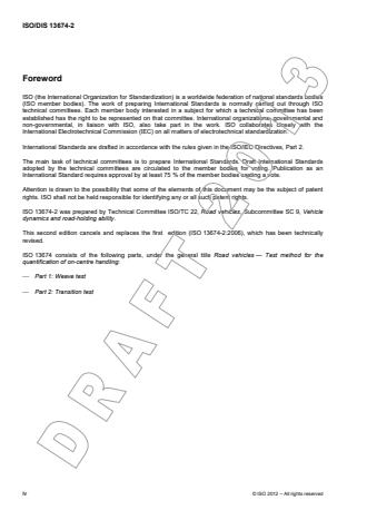 ISO 13674-2:2016 is a standard published by the International Organization for Standardization (ISO). Its full title is "Road vehicles - Test method for the quantification of on-centre handling - Part 2: Transition test". This standard covers: ISO 13674-2:2016 specifies a test schedule that addresses a particular aspect of the transition test, the on-centre handling characteristics of a vehicle. It is applicable to passenger cars in accordance with ISO 3833 and to light trucks, N1 category. NOTE The manoeuvre specified in this test method is not representative of real driving conditions, but is useful for obtaining measures of vehicle on-centre handling behaviour in response to a specific type of steering input under closely controlled test conditions. Other aspects of on-centre handling are addressed in the companion ISO 13674‑1.
