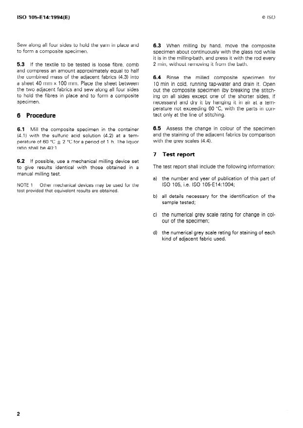 ISO 105‑E14:1994 specifies a laboratory method for measuring colour fastness to acid-felting (mild) for textiles. It defines a controlled procedure in which a test specimen, placed in contact with adjacent (auxiliary) fabrics, is milled in a dilute hot mineral acid (sulfuric acid) bath, rinsed and dried. The standard quantifies both the change in the specimen’s colour and the staining transferred to adjacent fabrics using the ISO grey scales.