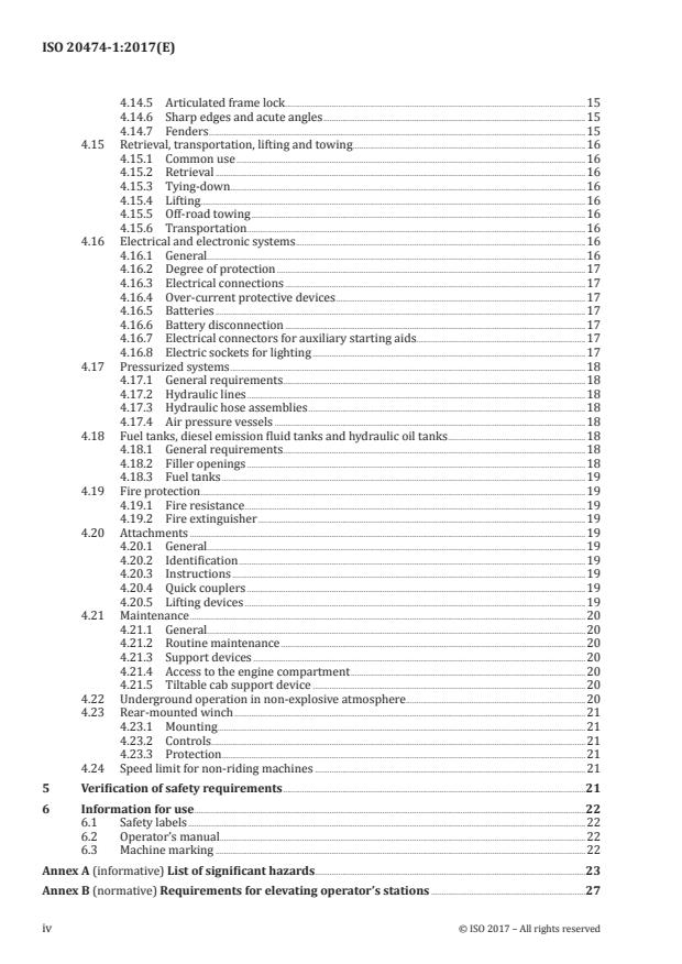 ISO 20474-1 consolidates general safety provisions used across the ISO 20474 series. Major topics include:
