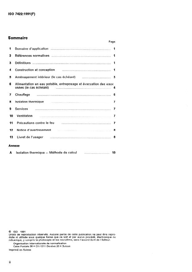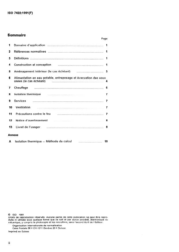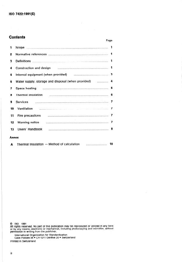 ISO 7422:1991 is a standard published by the International Organization for Standardization (ISO). Its full title is "Leisure accommodation vehicles — Caravans — Habitation requirements". This standard covers: Specifies certain functional and safety requirements. Includes: construction and design, internal equipment, water supply, storage and disposal, space heating, thermal insulation, services, ventilation, fire precautions, warning notice and users' handbook. Annex A forms an integral part of this standard.