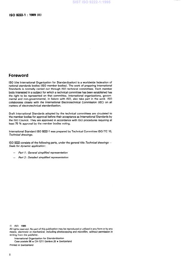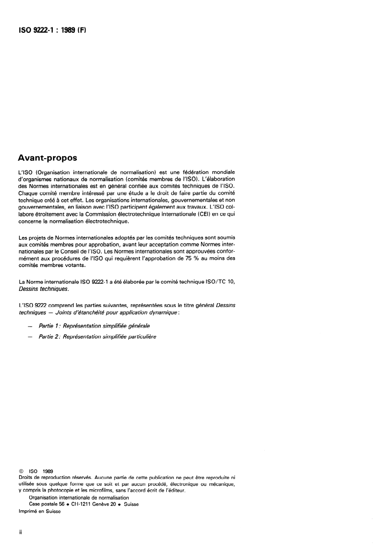 ISO 9222-1:1989 is a standard published by the International Organization for Standardization (ISO). Its full title is "Technical drawings - Seals for dynamic application - Part 1: General simplified representation". This standard covers: This method indicates only essential features ans should be used when it is not necessary to show the exact shape and details of the seals, for example in assembly drawings. The degree of simplification depends on the kind of object represented, the scale of the drawing and the purpose of documentation. ISO 9222-2 deals with the detailed simplified representation.