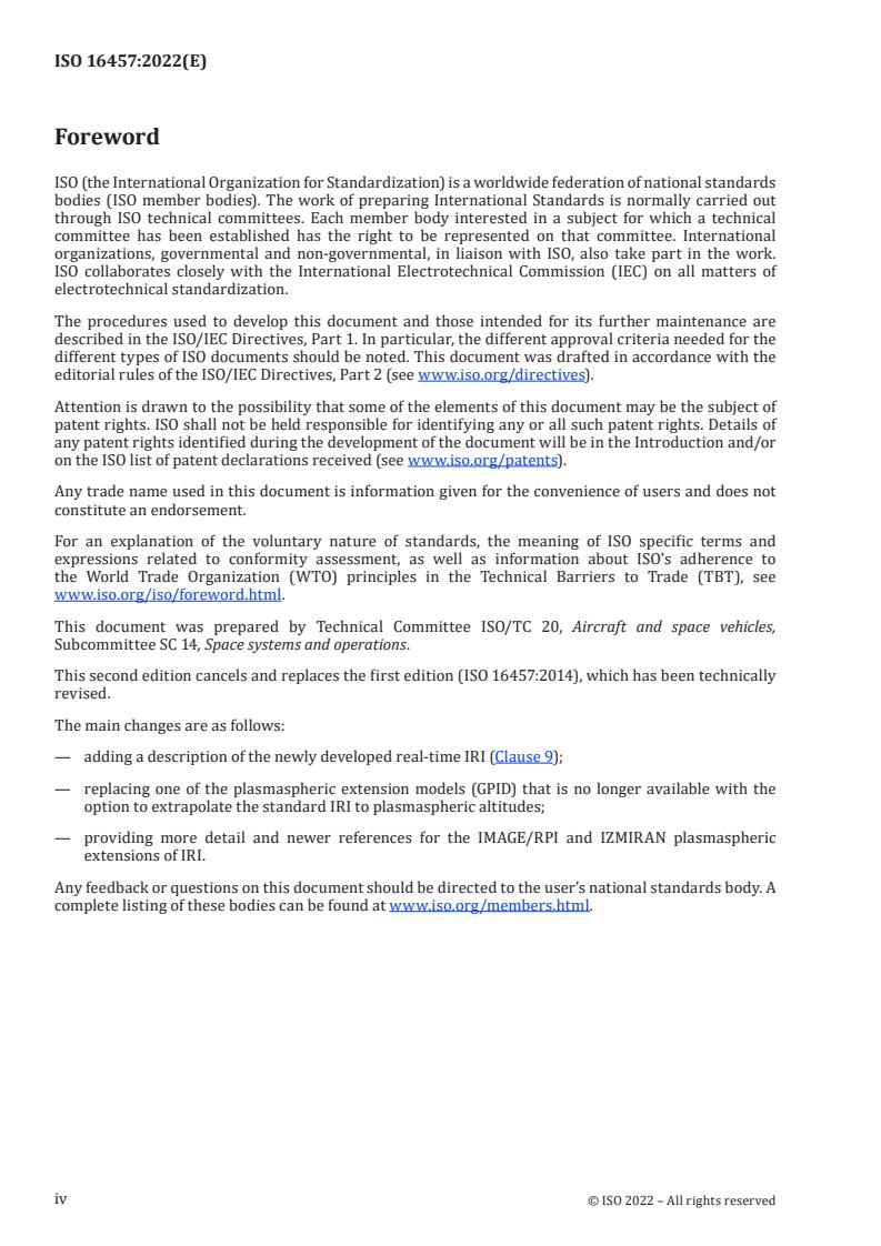 ISO 16457:2022 is a standard published by the International Organization for Standardization (ISO). Its full title is "Space environment (natural and artificial) - The Earth's ionosphere model - International reference ionosphere (IRI) model and extensions to the plasmasphere". This standard covers: This document provides guidance to potential users for the specification of the global distribution of ionosphere densities and temperatures, as well as the total content of electrons in the height interval from 50 km to 1 500 km. It includes and explains several options for a plasmaspheric extension of the model, embracing the geographical area between latitudes of 80°S and 80°N and longitudes of 0°E to 360°E, for any time of day, any day of year, and various solar and magnetic activity conditions. A brief introduction to ionospheric and plasmaspheric physics is given in Annex A. Annex B provides an overview over physical models, because they are important for understanding and modelling the physical processes that produce the ionospheric plasma.