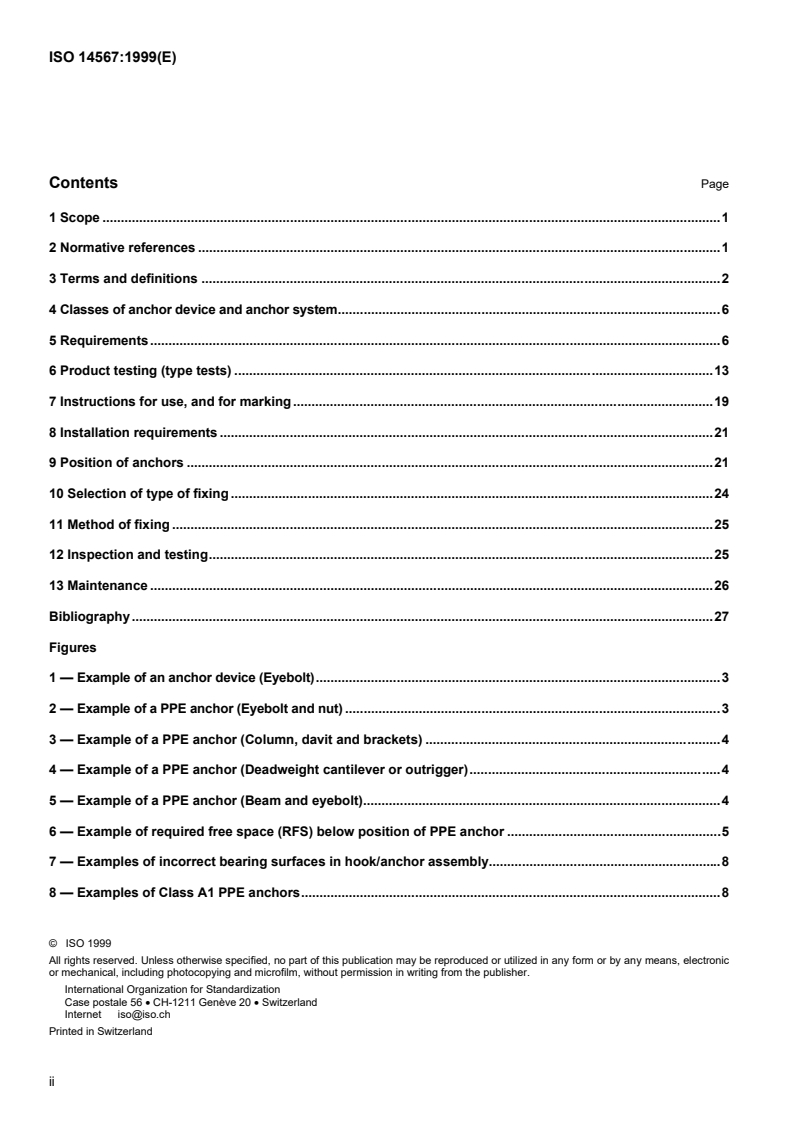 ISO 14567:1999 specifies safety and performance requirements for single-point anchor devices used exclusively as attachment points for personal protective equipment (PPE) against falls from height. The standard covers permanent and temporary single-point anchors for fall arrest, work positioning and travel restriction (restraint). It sets scope, test methods, marking/labeling, packaging, installation, inspection and maintenance guidance for anchors intended for a single user.