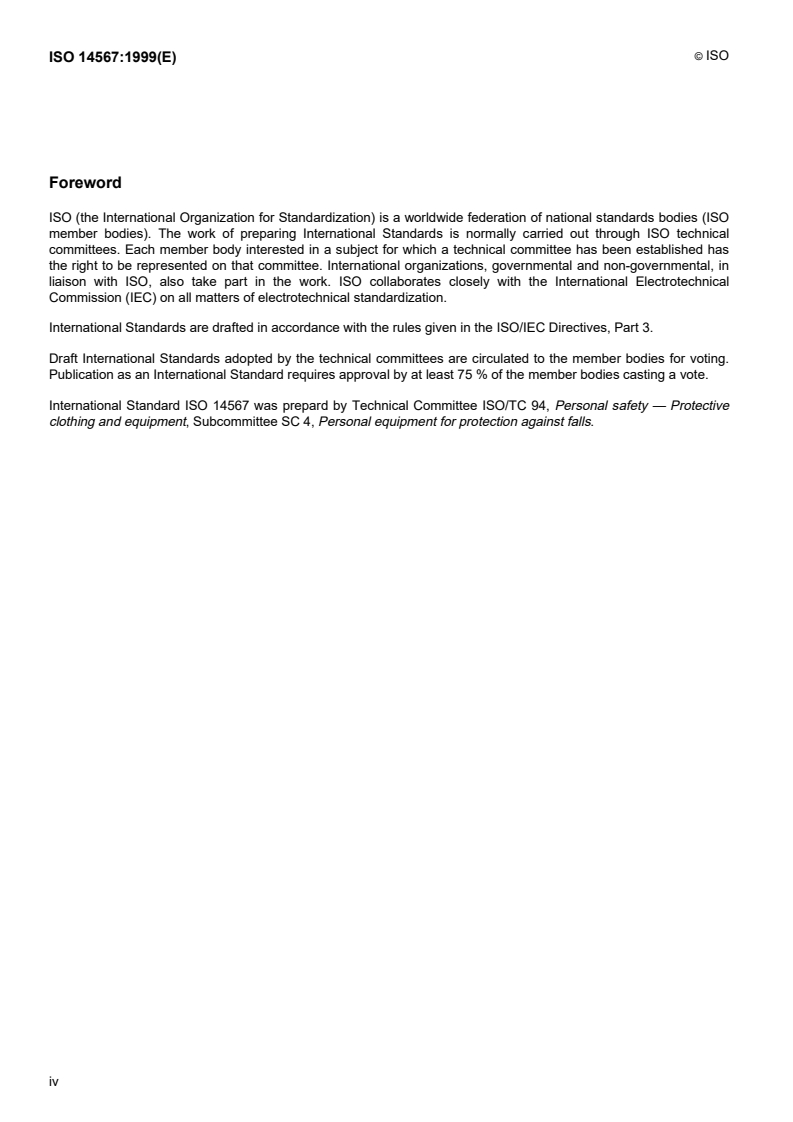 ISO 14567:1999 is a standard published by the International Organization for Standardization (ISO). Its full title is "Personal protective equipment for protection against falls from a height - Single-point anchor devices". This standard covers: This International Standard specifies requirements, test methods, and marking, labelling and packaging, as appropriate, of both permanent and temporary single-point anchor devices exclusively for the attachment of personal protective equipment (PPE) for protection against falls from a height for fall arrest, work positioning and travel restriction (work restraint). It is applicable only to anchor devices for PPEs that conform to ISO 10333-1, ISO 10333-2, ISO 10333-3 and ISO 10333-5. NOTE 1 Further standards are in preparation for other types of PPE: ISO 10333-6 and ISO 14566 (see bibliography). Anchor devices are rated to sustain a maximum (dynamic) arresting force of 6,0 kN, and a maximum (static) loading of 1,0 kN (assuming a person of 100 kg mass) in post-fall arrest suspension, work-positioning mode, or restraint mode. Anchor devices are intended for single person use only. A rescuer should not attach to the same anchor device as a person being rescued, unless the anchor device has been specifically designed for such purposes, and the instructions for use specifically permit this application. NOTE 2 Vertical rigid or flexible line systems and horizontal lifelines are not within the scope of this International Standard, but are covered in ISO 10333-4 and ISO 16024.
