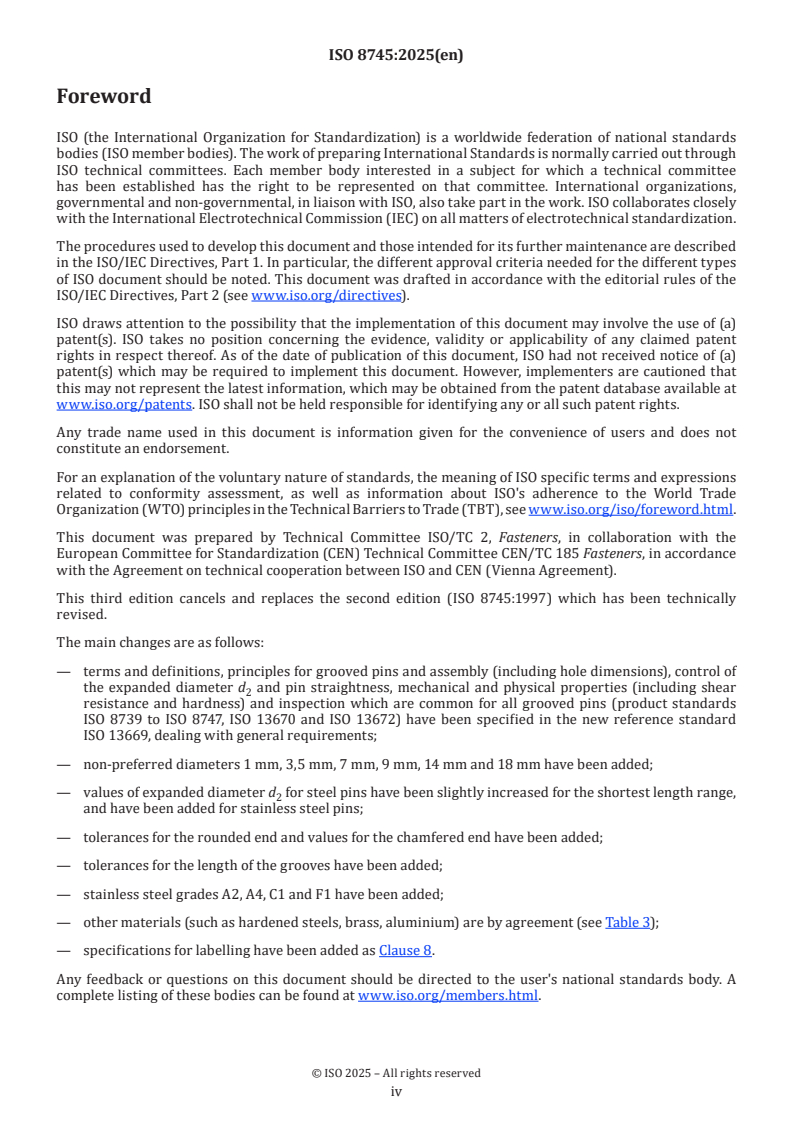 Keywords: ISO 8745:2025, taper grooved pins, half-length progressive grooves, fasteners, steel, stainless steel, expanded diameter.