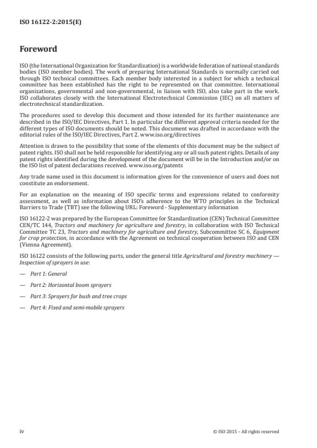 - Other referenced norms in the introduction: ISO 16119 series (environmental risk) and ISO 4254-6 (safety for new sprayers).