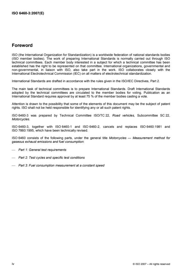 ISO 6460-3:2007 is a standard published by the International Organization for Standardization (ISO). Its full title is "Motorcycles - Measurement method for gaseous exhaust emissions and fuel consumption - Part 3: Fuel consumption measurement at a constant speed". This standard covers: ISO 6460-3:2007 specifies the methods of measurement for fuel consumption at a constant speed on the road and on the chassis dynamometer. It is applicable to motorcycles as defined in ISO 3833 equipped with a spark ignition engine (four-stroke engine, two-stroke engine or rotary piston engine) or a compression ignition engine.