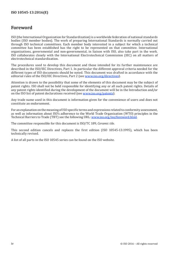 Cette deuxième édition annule et remplace la première (ISO 10545-13:1995), qui a fait l’objet d’une