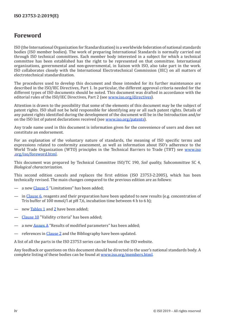 이 문서에서는 ISO 23753-2:2019에 대해 설명하고 있으며, 이는 토양에서 디하이드로기나아제 활성을 결정하는 방법에 관한 표준이다. 이 표준에서는 2-(4-iodophenyl)-3-(4-nitrophenyl)-5-phenyltetrazolium chloride (INT)라는 물질을 사용하여 활성을 측정한다. 이 방법은 TTC-방법에 비해 산소에 덜 민감하므로 더 견고하다.