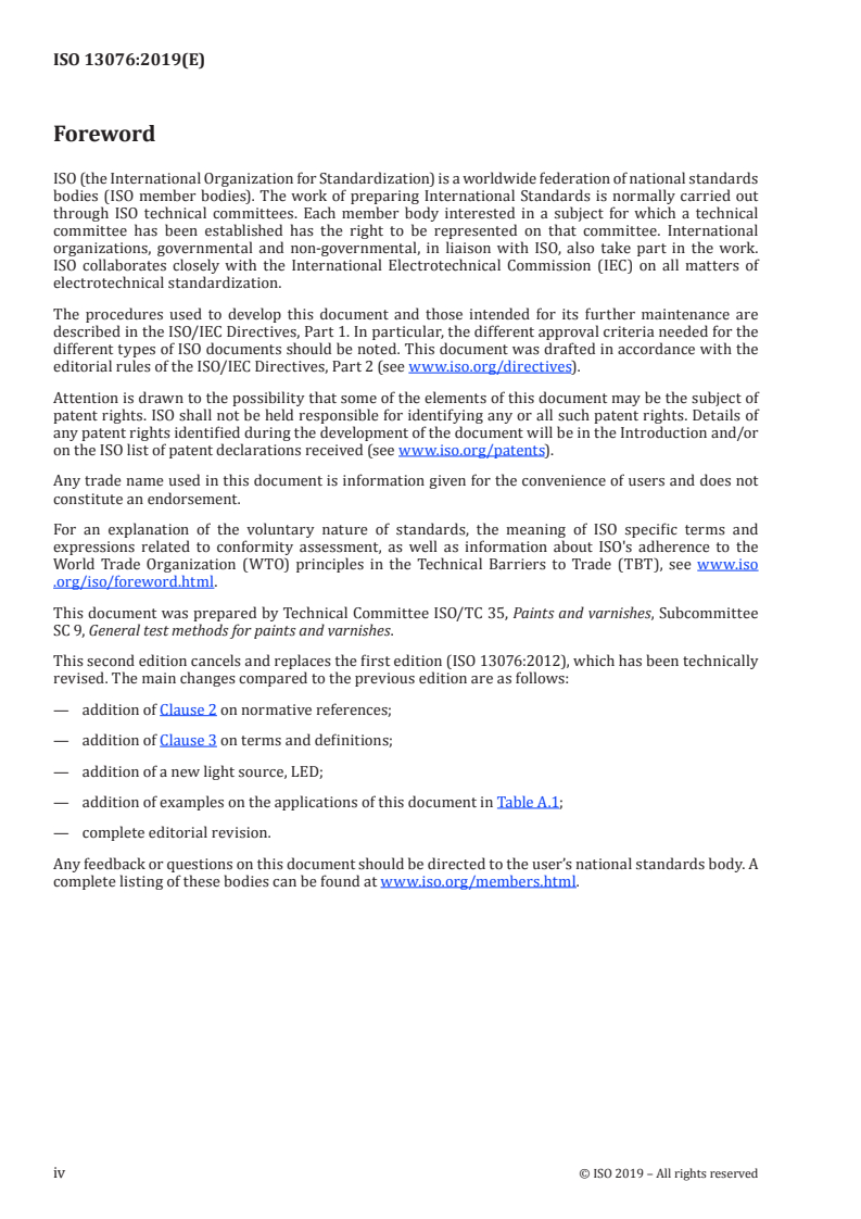 ISO 13076:2019 is a standard published by the International Organization for Standardization (ISO). Its full title is "Paints and varnishes - Lighting and procedure for visual assessments of coatings". This standard covers: This document specifies the lighting and the procedure for the visual assessment of degraded areas, spots or other defects on or in coatings. This document is not applicable to the visual comparison of colour, which can be assessed using ISO 3668. NOTE See Annex A for examples of the possible applications of this document.