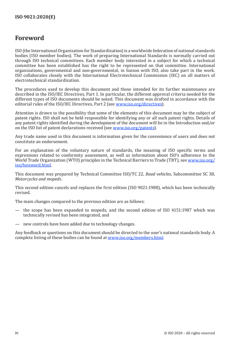 ISO 9021:2020 is a standard published by the International Organization for Standardization (ISO). Its full title is "Motorcycles and mopeds - Controls - Types, positions and functions". This standard covers: This document describes the types, positions and functions of the rider-operated controls on a motorcycle/moped[1], in order to facilitate use. Annex A specifies controls, indicators and tell-tales for which identification is obligatory and the appropriate graphical symbols. Annex B provides the information for applying for electrically propelled motorcycle/moped1). This document applies to those controls which, when fitted, are commonly used by the rider of a motorcycle/moped. The definition or specification of a control does not signify the mandatory presence of each and every control listed in this document on a vehicle. [1] "motorcycle/moped" as defined in ISO 3833 but does not include a steering wheel type.