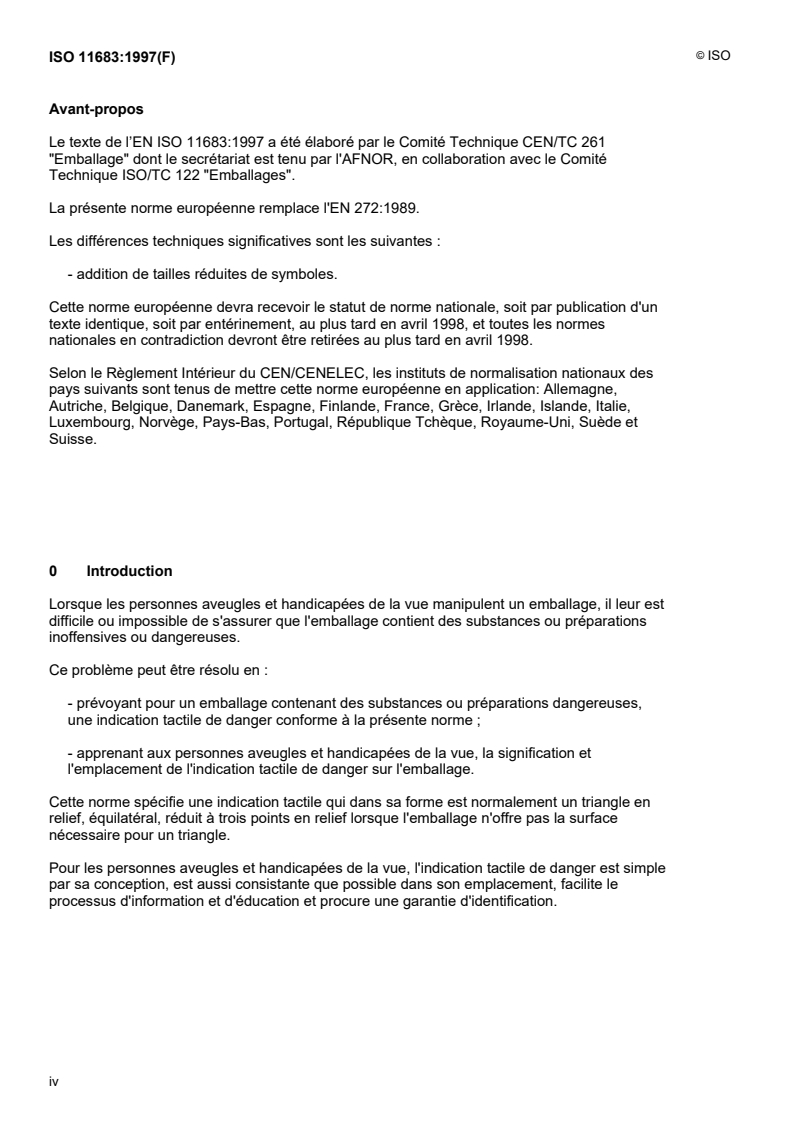 ISO 11683:1997 - Emballages — Indications tactiles de danger — Exigences Released:8/27/1998