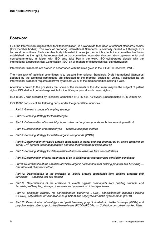 ISO 16000-7:2007 is a standard published by the International Organization for Standardization (ISO). Its full title is "Indoor air - Part 7: Sampling strategy for determination of airborne asbestos fibre concentrations". This standard covers: ISO 16000-7:2007 specifies procedures to be used in planning of air measurements to determine the concentrations of asbestos in indoor atmospheres. Careful planning of the measurement strategy is important, because the results can become the basis of recommendations for major building renovations, or for the return of a building to normal occupancy status after removal of asbestos-containing materials. ISO 16000-7:2007 uses the following definition for indoor environments as specified in ISO 16000-1: dwellings having living rooms, bedrooms, do-it-yourself (DIY) rooms, recreation rooms, cellars, kitchens and bathrooms; workrooms or workplaces in buildings which are not subject to health and safety inspections in regard to air pollutants (for example, offices and sales premises); public and commercial buildings (for example, hospitals, schools, kindergartens, sports halls, libraries, restaurants and bars, theatres and other function rooms); cabins of vehicles and public transport.
