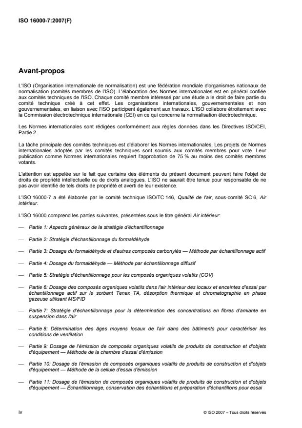 L'ISO 16000-7:2007 spécifie les modes opératoires à employer dans la planification des mesurages de l'air pour la détermination des concentrations en amiante des atmosphères intérieures. Il est important de planifier attentivement la stratégie de mesurage car les résultats peuvent constituer la base de recommandations visant les rénovations majeures d'un bâtiment ou le retour à la normale de l'occupation d'un bâtiment après retrait des matériaux contenant de l'amiante. L'ISO 16000-7:2007 utilise la définition des environnements intérieurs telle que spécifiée dans l'ISO 16000-1: habitations possédant des séjours, des chambres à coucher, des pièces pour le bricolage, des salles de jeu, des caves, des cuisines et des salles de bain; pièces ou lieux de travail au sein des bâtiments non soumis aux inspections d'hygiène et sécurité concernant les polluants de l'air intérieur (par exemple, bureaux, locaux commerciaux); bâtiments publics ou commerciaux (par exemple hôpitaux, écoles, jardins d'enfants, salles de sport, bibliothèques, restaurants et bars, théâtres et autres salles); habitacles des véhicules et des transports en commun.