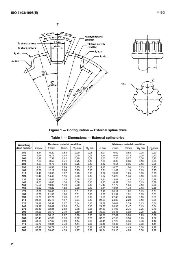 - External and internal configurations: Figures and tables in the standard cover both external (male) and internal (female) spline wrenching configurations.