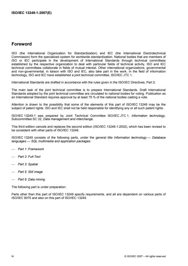 ISO/IEC 13249 defines a number of packages of generic data types common to various kinds of data used in multimedia and application areas, to enable that data to be stored and manipulated in an SQL database. The package in each subject area is defined as a part of ISO/IEC 13249. ISO/IEC 13249-1:2007 defines those concepts, notations and conventions that are common to two or more other parts of ISO/IEC 13249. In particular, it describes the way ISO/IEC 9075 is used in other parts of ISO/IEC 13249 to define the user-defined types and their behaviour appropriate to each subject area.