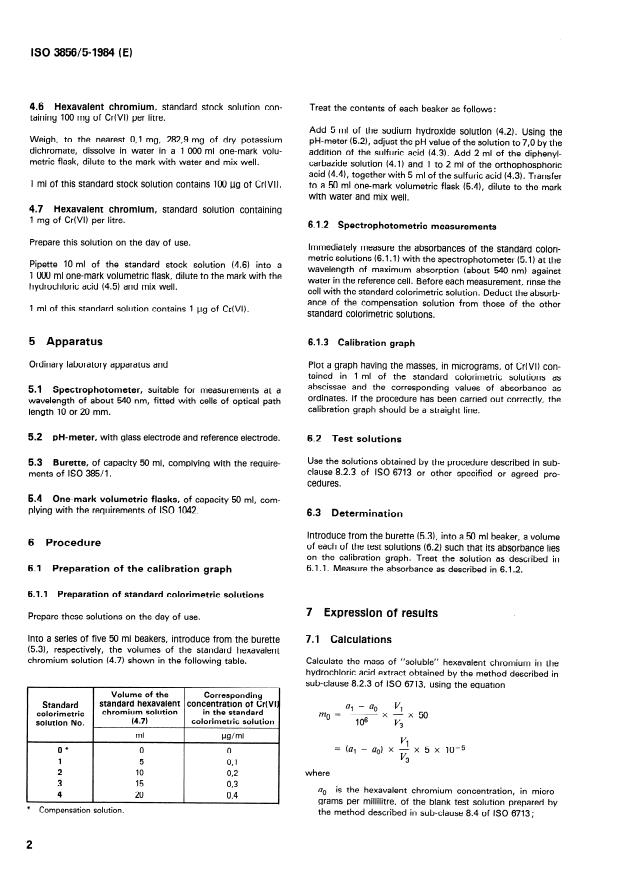 ISO 3856-5:1984 is a standard published by the International Organization for Standardization (ISO). Its full title is "Paints and varnishes - Determination of "soluble" metal content - Part 5: Determination of hexavalent chromium content of the pigment portion of the liquid paint or the paint in powder form - Diphenylcarbazide spectrophotometric method". This standard covers: The principle consists in formation of a coloured complex from hexavalent chromium and diphenylcarbazide solution. After addition of orthophosphoric acid and sulfuric acid, spectralphotometric easurement of the colour at a wavelength in the region of 540 nm. The method is applicable to coating materials having hexavalent chromium contents in the range of about 0,05 % (m/m) to 5 % (m/m). This method id the referee method in cases of dispute. This second edition cancels and replaces the ISO 3856/5-1980, of which it constitutes a through revision.