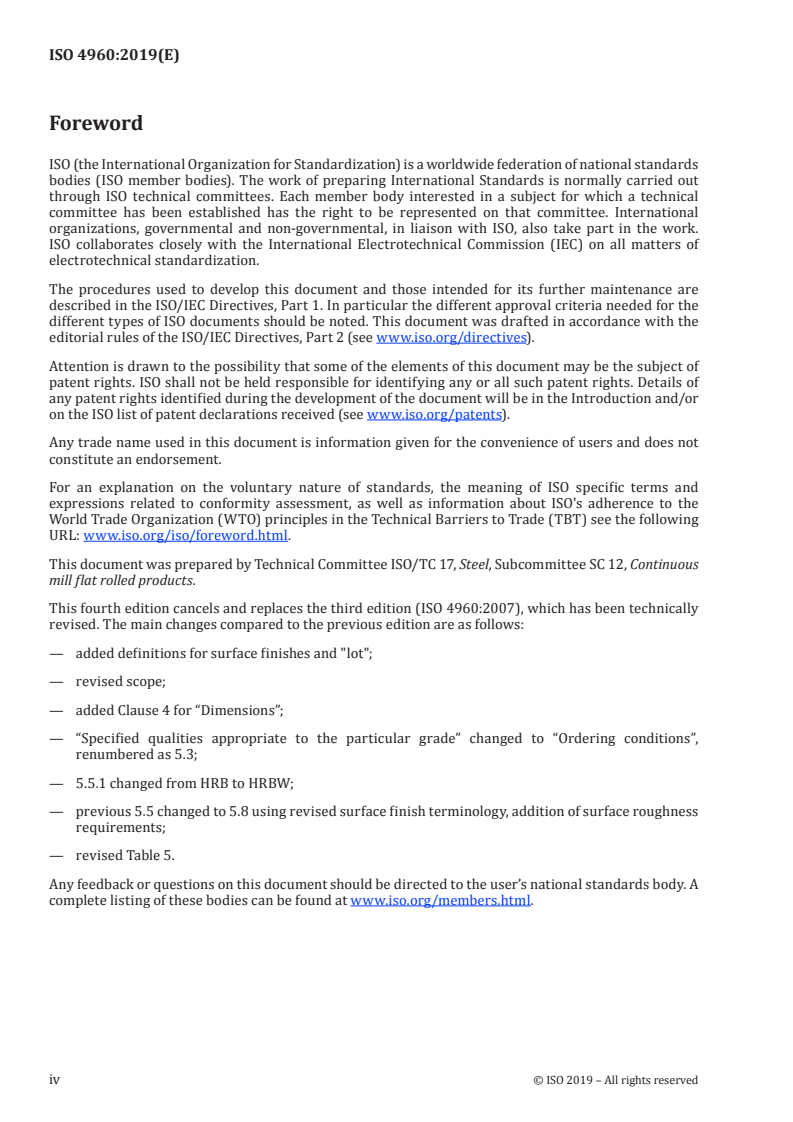 ISO 4960:2019 is a standard published by the International Organization for Standardization (ISO). Its full title is "Steel strip, cold-reduced with a mass fraction of carbon over 0,25 %". This standard covers: This document specifies the minimum requirements for steel strip of carbon over 0,25 %, in coils and cut lengths. The product is applicable to highly stressed parts of many different types and is characterized by close dimensional tolerances and controlled surface finishes. The steel strip is produced in a number of types and surface finishes to be compatible with differing applications requirements. This document does not apply to alloy steels or stainless steels.