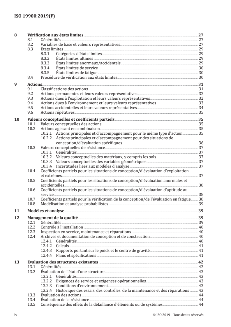 ISO 19900:2019 is a standard published by the International Organization for Standardization (ISO). Its full title is "Petroleum and natural gas industries - General requirements for offshore structures". This standard covers: This document specifies general requirements and recommendations for the design and assessment of bottom-founded (fixed) and buoyant (floating) offshore structures. This document is applicable for all phases of the life of the structure, including: - successive stages of construction (i.e. fabrication, transportation, and installation), - service in-place, both during design life and during any life extensions, and - decommissioning, and removal. This document contains general requirements and recommendations for both the design of new build structures and for the structural integrity management and assessment of existing structures. This document does not apply to subsea and riser systems or pipeline systems.