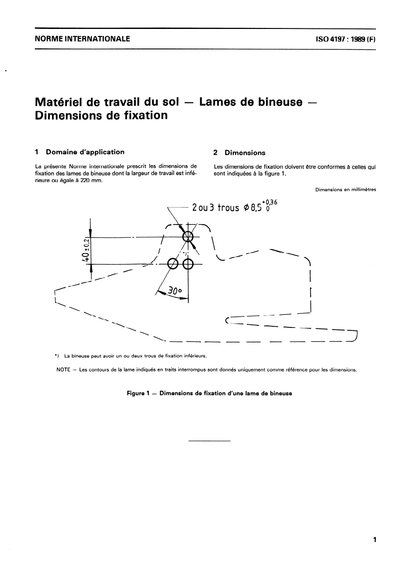 ISO 4197:1989, "Equipment for working the soil - Hoe blades - Fixing dimensions," is the second edition (1989) of an ISO standard prepared by ISO/TC 23 (Tractors and machinery for agriculture and forestry). It cancels and replaces ISO 4197:1981 and specifies the standard fixing dimensions for hoe blades with a working width up to and including 220 mm. The standard presents contours, hole locations and dimensional data in millimetres (illustrated in Figure 1).