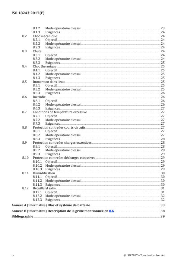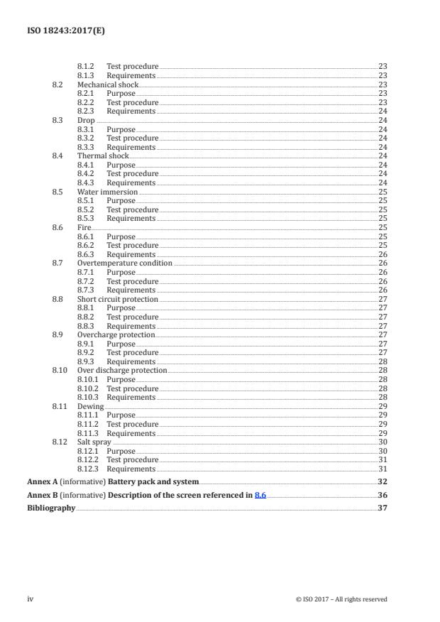 ISO 18243:2017 organizes test methods and requirements into performance and safety/reliability sections. Key technical topics include: