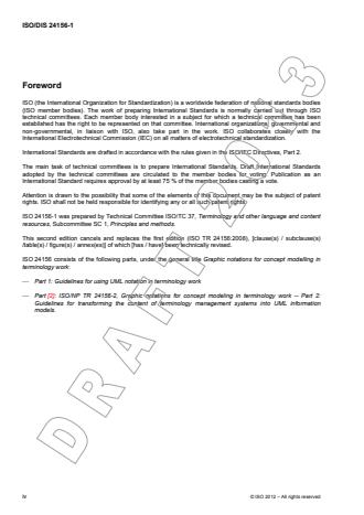 ISO 24156-1:2014 gives guidelines for using a subset of UML symbols independent of their normal UML meaning, to represent concepts in concept models that result from concept analysis. It describes how UML symbols can be used for that. A UML profile designed for this purpose is used to represent concepts and concept relations in terminology work. ISO 24156-1:2014 does not describe UML and its general use in depth. These matters are covered in ISO/IEC 19505‑1 and ISO/IEC 19505‑2. ISO 24156-1:2014 does not describe the principles and methods of terminology work. This is covered in ISO 704. ISO 24156-1:2014 does not define the fundamental concepts of terminology work. This is covered in ISO 1087‑1.