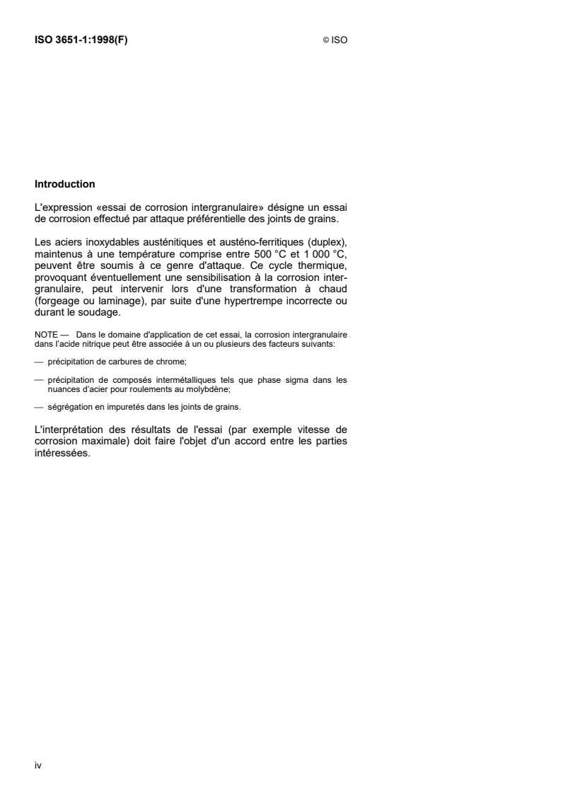 ISO 3651-1:1998 - Détermination de la résistance à la corrosion intergranulaire des aciers inoxydables — Partie 1: Aciers inoxydables austénitiques et austéno-ferritiques (duplex) — Essai de corrosion en milieu acide nitrique par mesurage de la perte de masse (essai de Huey) Released:5/13/1998