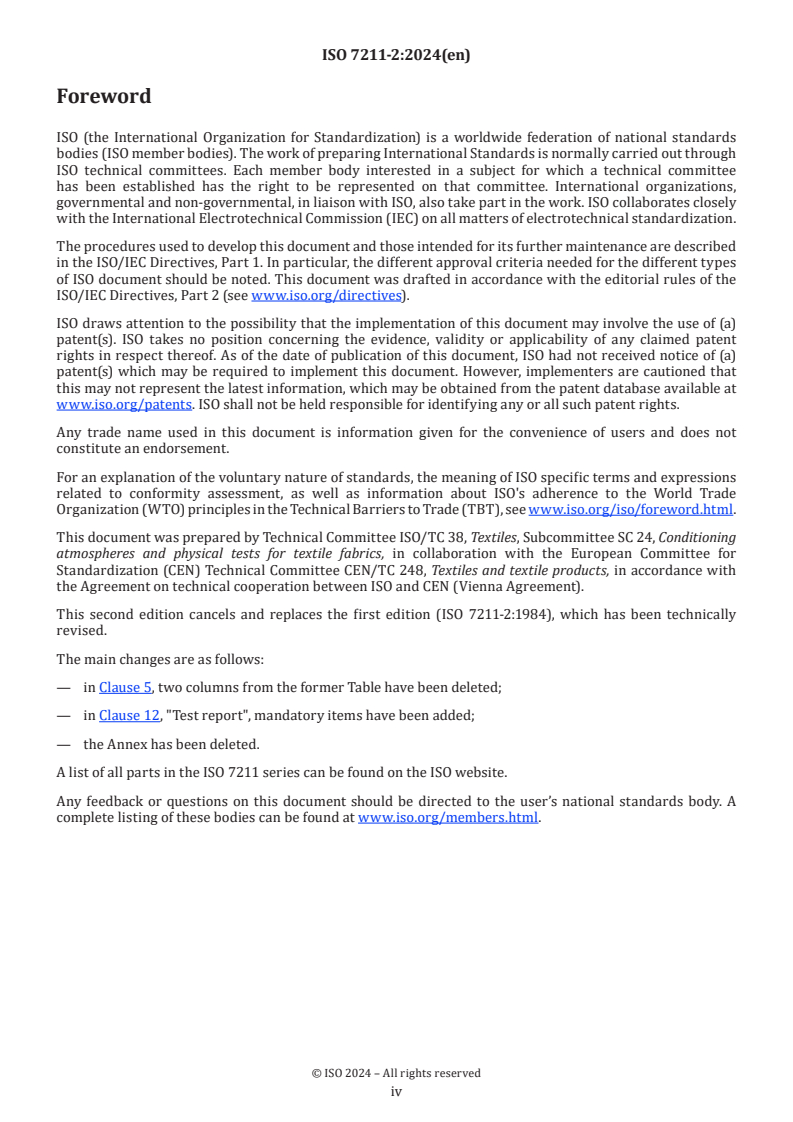 ISO 7211-2:2024 presents a comprehensive standard for analyzing woven fabric construction, specifically addressing the determination of the number of threads per unit length. This document lays out an essential framework comprising three distinct methods, accommodating various types of woven fabrics based on their characteristics. The strength of this standard lies in its inclusivity and flexibility. By offering Method A, Method B, and Method C, it caters to a diverse array of fabric structures, ensuring that users can select the most appropriate technique based on their specific requirements. Method A, despite being the most labor-intensive, provides robust reliability and is particularly invaluable for intricate weaves and folded structures that may be inadequately assessed using the alternative methods. This adaptability positions ISO 7211-2:2024 as a significant tool for textile manufacturers and professionals, enabling precise quality control and consistent analysis across different fabric types. Moreover, the clarity provided in the standard regarding the hierarchy of methods, with Method A taking precedence in disputes, enhances its relevance as a definitive guide in the textile industry. The document also offers practical solutions for fabrics with a lower thread count, allowing results to be expressed in threads per decimetre, thus broadening its applicability. Overall, ISO 7211-2:2024 is an indispensable resource for any textile professional, ensuring standardization in the method of thread counting, which is critical for quality assurance and classification of woven fabrics. Its structured approach not only reinforces accuracy in measurement but also promotes consistency within the textile industry.