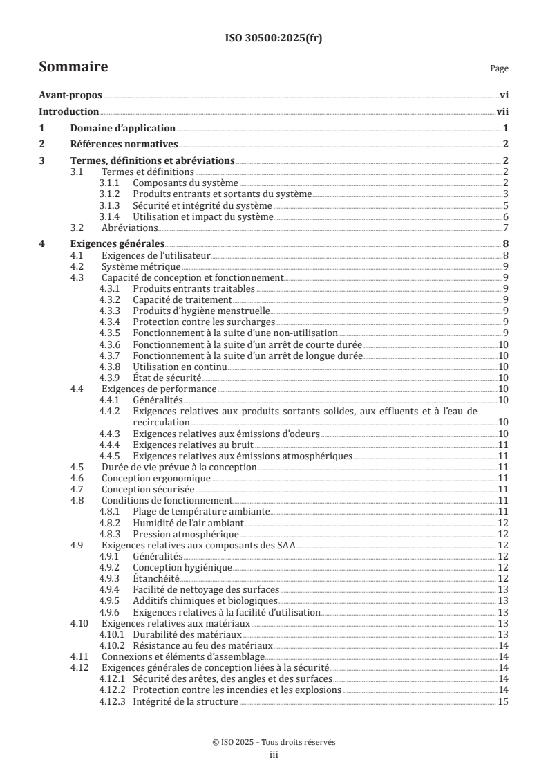 ISO 30500:2025 establishes essential safety and performance requirements for the design and testing of non-sewered sanitation systems (NSSS), specifically focusing on prefabricated integrated treatment units. The standard addresses the critical need for sustainable sanitation solutions, integrating limited environmental considerations such as nutrient recovery, water consumption and reuse, energy efficiency, and life cycle assessment. The scope of ISO 30500:2025 is meticulously outlined, ensuring it applies to NSSS manufactured either as a complete package or as a collection of prefabricated components designed to be assembled without further modification. This flexibility allows the standard to encompass a wide range of systems, catering to varied contexts where conventional sewage systems are not viable. One of the notable strengths of ISO 30500:2025 is its comprehensive approach to human health and environmental safety. The standard mandates that NSSS must effectively collect, treat, and manage both solid and liquid outputs, ensuring safe reuse or environmentally sound disposal. By defining the basic treatable input primarily as human excreta, it provides a clear guide for practitioners to establish systems capable of handling the most critical waste materials. Additionally, the focus on the quality of outputs and potential recirculated water underpins the standard's commitment to public health and ecological integrity. The standard’s emphasis on functionality, usability, reliability, and maintainability further enhances its relevance. By laying out clear criteria for these aspects, ISO 30500:2025 aids manufacturers and developers in creating systems that are not only effective but also user-friendly and sustainable in practice. Moreover, while the standard primarily addresses systems operating independently of water and electricity networks, it remains adaptable to contexts where such resources are available, offering guidelines that can be applied across diverse settings. ISO 30500:2025 does delineate its boundaries, explicitly stating what it does not cover, such as installation guidelines and external disposal processes, which allows for a focused application of its provisions. This clarity ensures that stakeholders can easily navigate the regulatory landscape without unnecessary complications. Overall, ISO 30500:2025 reinforces the importance of innovation in sanitation through its robust safety and performance requirements, making it a pivotal standard for non-sewered sanitation systems. Its emphasis on sustainability and public health addresses pressing global challenges, thereby solidifying its relevance in the contemporary discourse surrounding sanitation solutions.